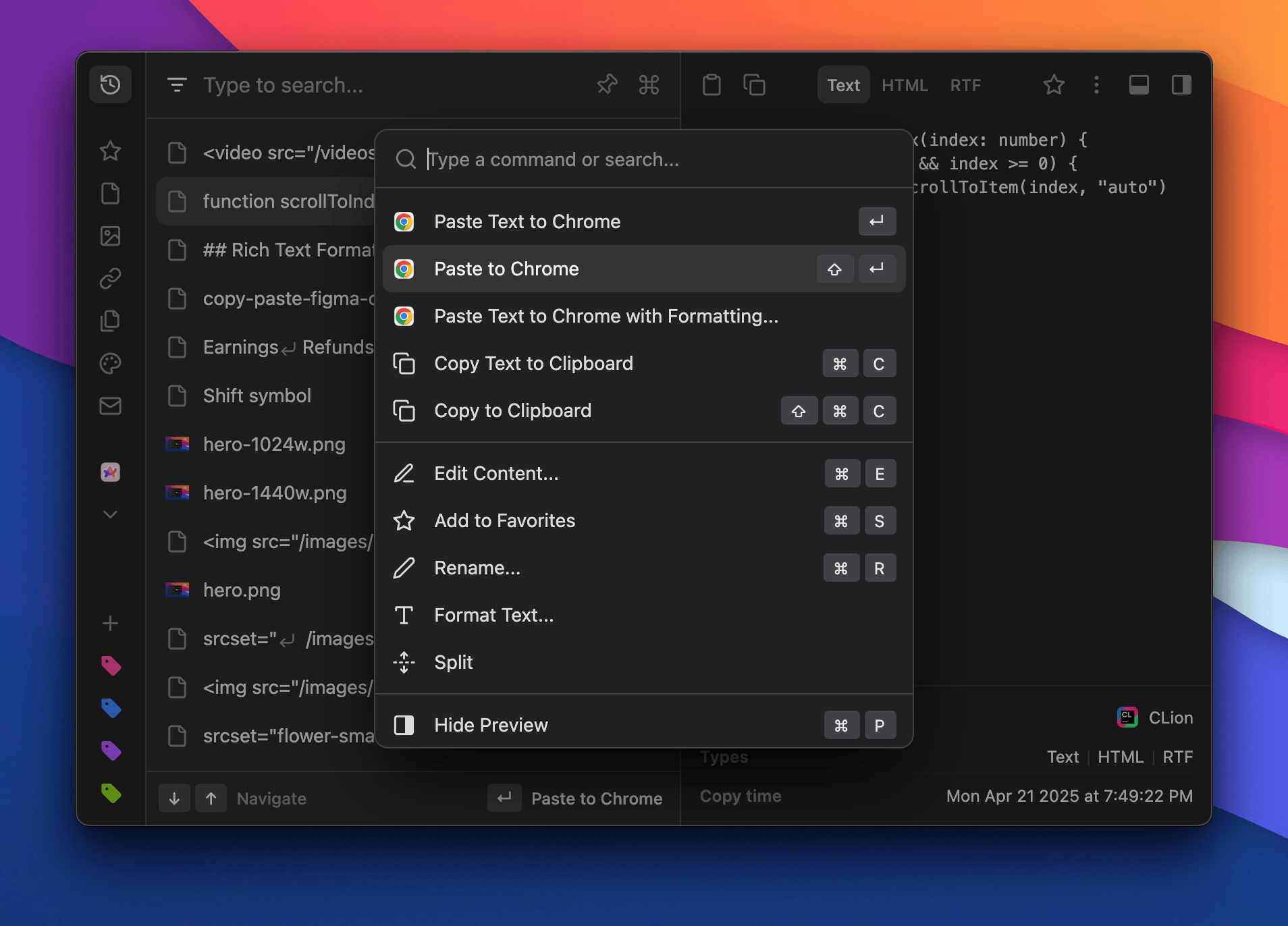 You can see in the video that the history item can now be stored in multiple formats: Plain Text, Rich Text Format (RTF), and HTML. You can switch between them in the Preview panel and even edit content for the different format separately.